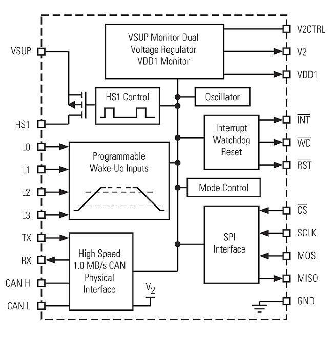 - An internally power supply voltage output with four wake-up inputs, programmable window watch-dog, interrupt, reset, high speed CAN transceiver and SPI input control