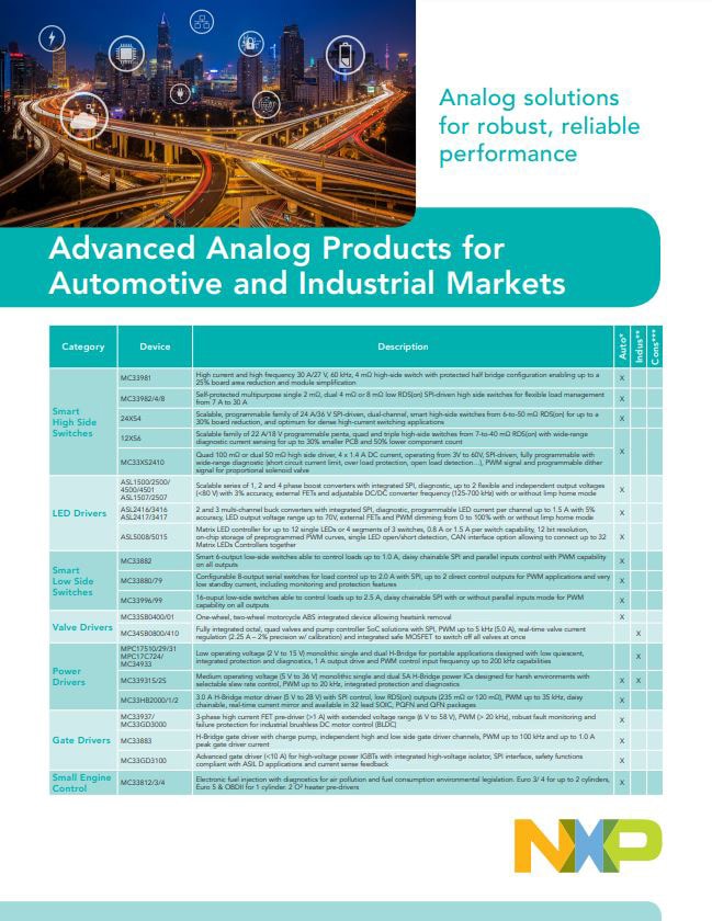 Read the selector guideNXP’s robust portfolio of automotive-compliant products includes over 700 devices and solutions that help enable breakthrough automotive designs.