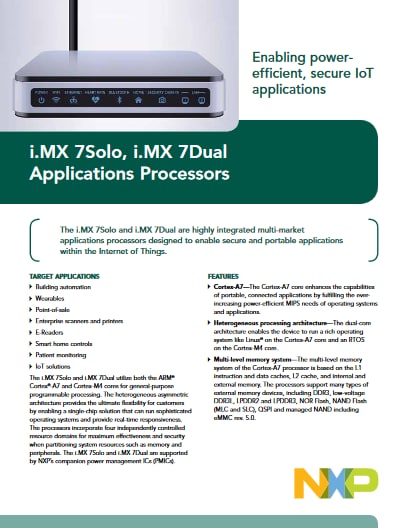 The i.MX 7Solo and i.MX 7Dual are highly integrated multimarket applications processors designed to enable secure and portable applications within the Internet of Things.