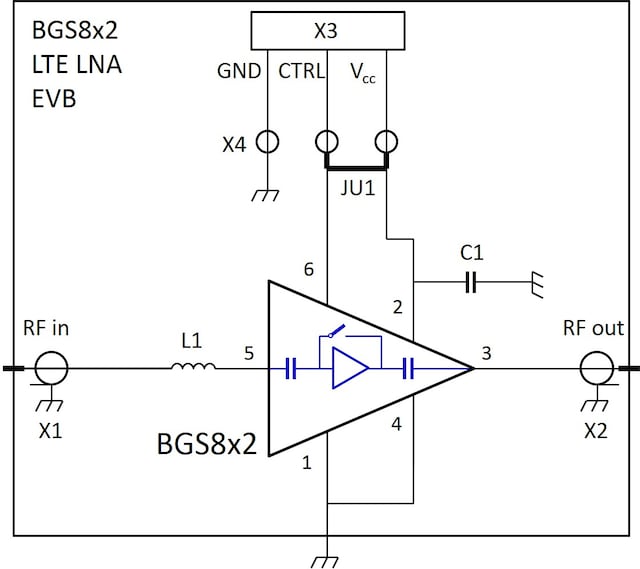 BGS8L2 LTE LNA with bypass switch evaluation board.