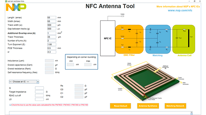 • Calculate the matching circuit for the following NXP NFC Reader ICs: PN7462/PN7362/PN7360, PN5180, PN5190, CLRC663/MFRC630/SLRC610, CLRC663 plus, PN7120, PN7150, PN7160, PN7642 and PN7220